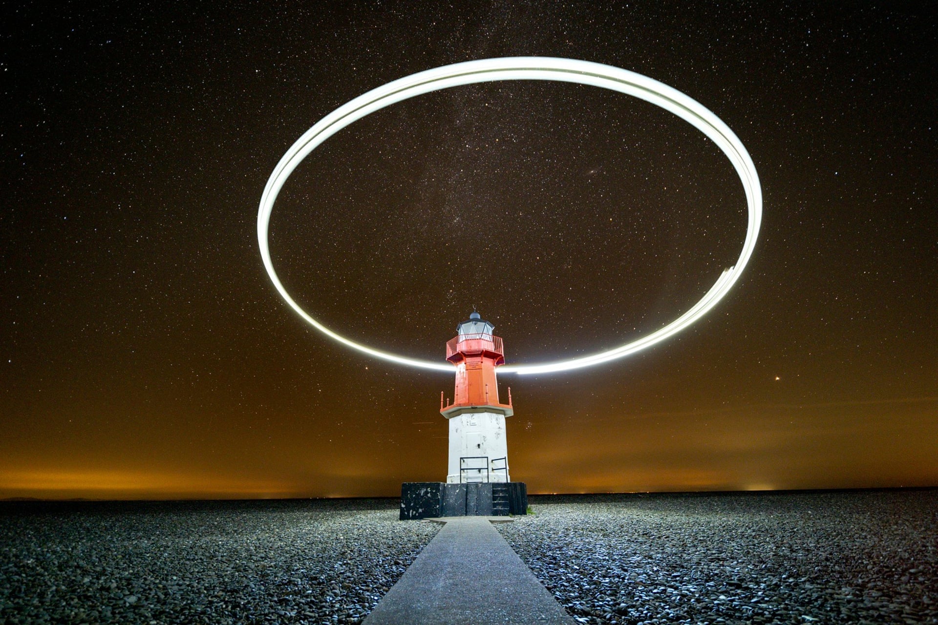 That little light is called “The Winkie” (stoppit already!) and is right at the very top of the Isle of Man. Photographer Glenn Whorrall has attached a big light to his drone and flown it around the lighthouse in a circle while taking a long exposure image on his camera. Like a more high tech, controlled version of this.