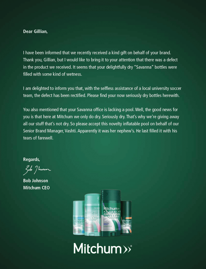 The Mitchum campaign is brilliant. It’s novel, it’s different and it really caught my attention. That Savanna also noted it and decided to interact has made things even better. I just hope that they can come back with a reply to Bob’s letter so that this can continue.
