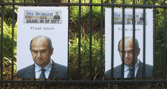 Posters of convicted fraudster, Schabir Shaik, who has been in and out of jail a number of times, were placed behind and in front of railings around Cape Town. The headline asks: ‘In or Out?’